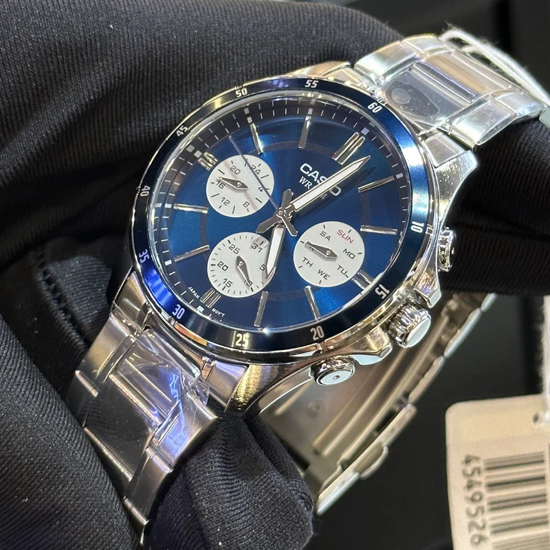 Elevate your wristwear with the Casio MTP-1374D-2A3VDF, a stylish blend of functionality and sophistication. The striking blue dial contrasts beautifully with the silver stainless steel case and bracelet, making it a standout accessory for any occasion. With a durable 43 mm round case and reliable quartz movement, this timepiece offers everyday practicality wrapped in timeless design.